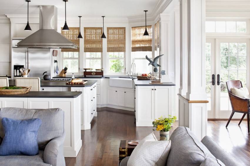 - позволяет зонировать пространство, разделив кухню на 2 зоны: рабочую и обеденную