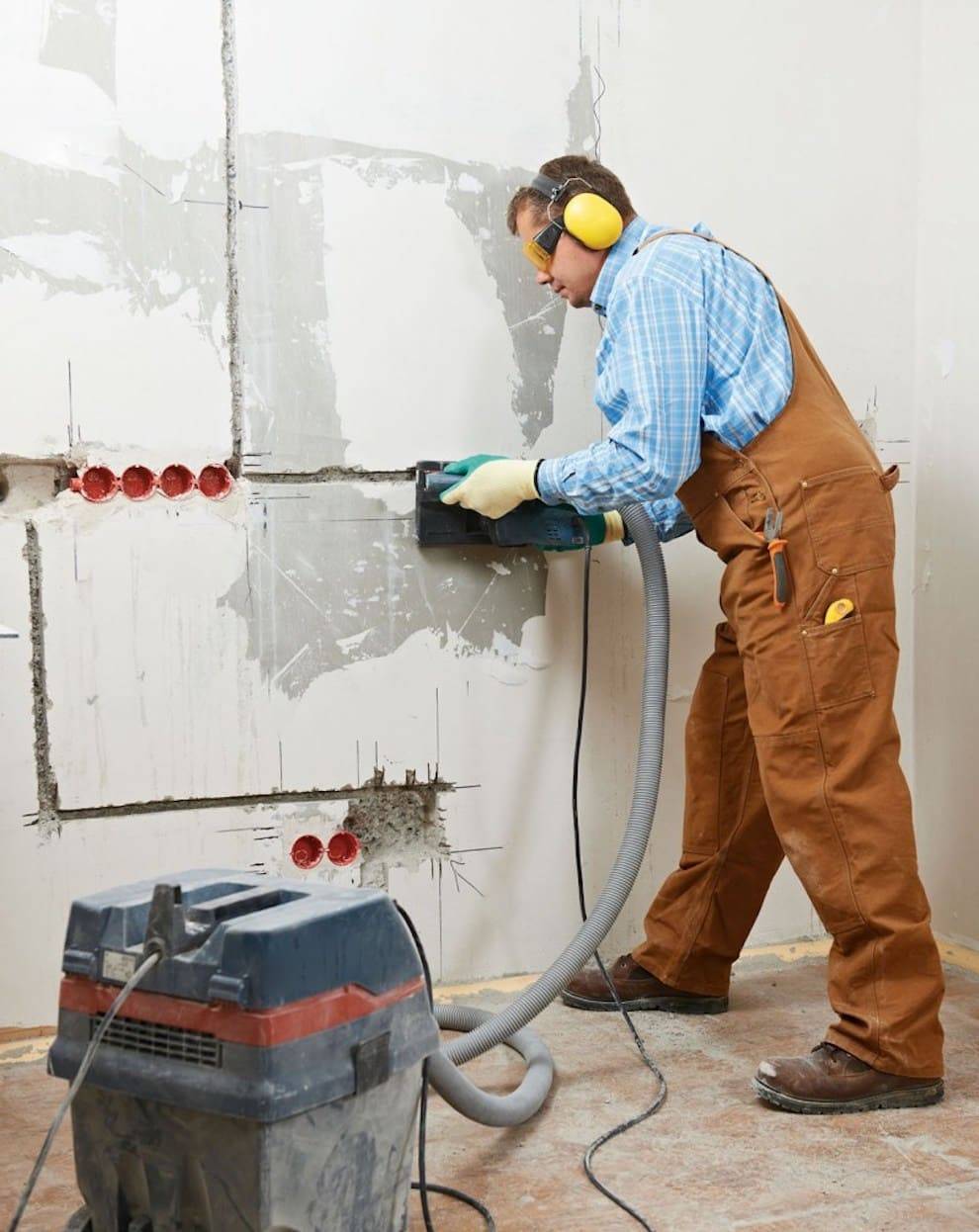 - С помощью перфоратора сделать углубление в стене в размеченных местах. Если на месте новых точек были старые, то их надо увеличить, но перед работой обязательно снять накладные панели, отключить подачу тока и вынуть механизм.