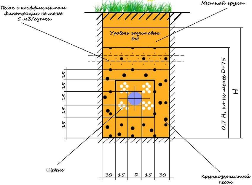 Если участок имеет высокий уровень грунтовых вод, проконсультируйтесь у специалиста, как можно увеличить эффект впитывания воды системой. Для этих целей используются изделия диаметром 300 мм на фильтре.
