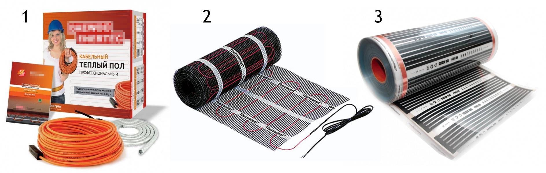 Виды электрических теплых полов:1 — Кабельный; 2 — Кабельный с армирующей сеткой; 3 — Пленочный (инфракрасный).
