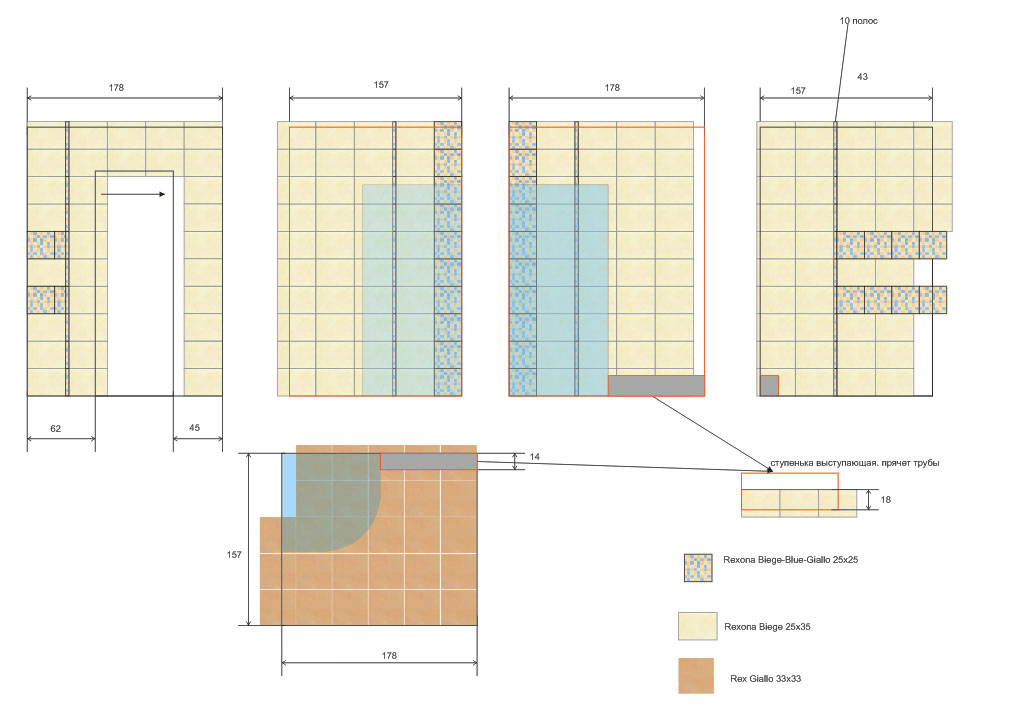 Не поленитесь сделать контрольную кладку этих двух рядов без использования раствора. Так вы сможете на глаз оценить будущую картину и окончательно определиться с типом укладки плитки.