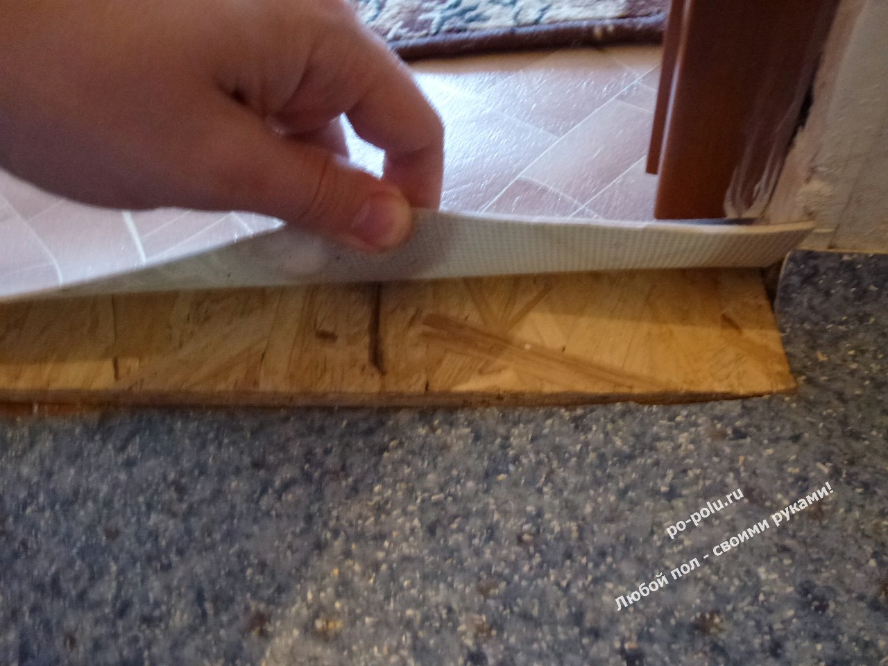 ! Укладка линолеума на пол, который не был предварительно подготовлен, приведет к «проявлению» всех межплиточных швов на линолеуме. Если не получается выровнять пол, покрытый керамическими плитками, удалите плитки, или застелите на плитку листы ДСП