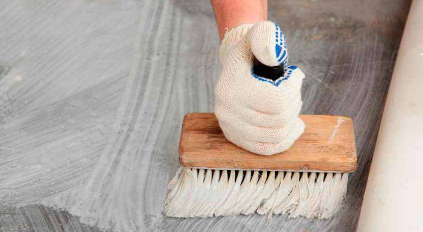 Для эффективного сцепления клеевых составов с основанием и снижения расхода, поверхность пола необходимо обеспылить. Выполнить эту операцию можно с помощью строительного пылесоса. Технология укладки линолеума на бетонный пол предусматривает обработку основания дисперсионными грунтовками на полимерной основе. Такие составы не только связывают мельчайшие частички остатков неудаленной пыли, но и проникая в верхний слой бетонной стяжки на 2-3 мм, укрепляют его, кристаллизуясь в порах.