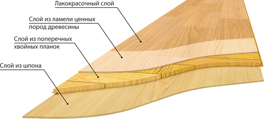 Многослойные ламели более устойчивы к расширению при изменении давления и повышения температуры. При небольшой влажности и перепадах температур средний слой сдерживает расширение верхней части древесных волокон. Состав из трех слоев делает половицу надежной, износостойкой. Если же влажность велика, то верхний слой трескается и слоится.