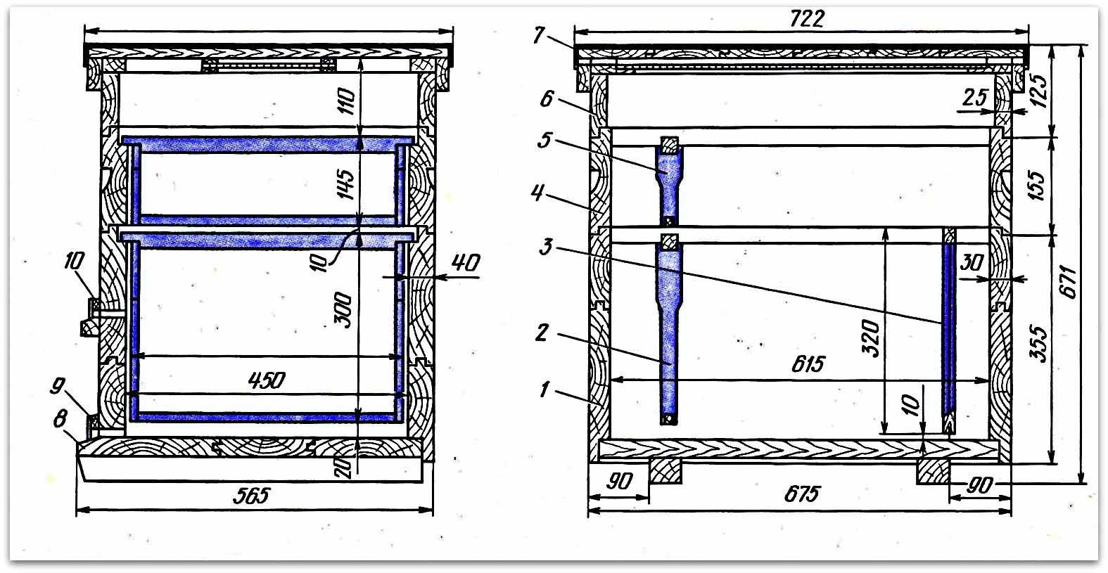 Вариация деревянного 16-рамочного улья, представленная выше, является ульем-лежаком, в котором предусмотрено горизонтальное расположение гнезда. По центру устанавливают гнездовые рамы, по краям – медовые.