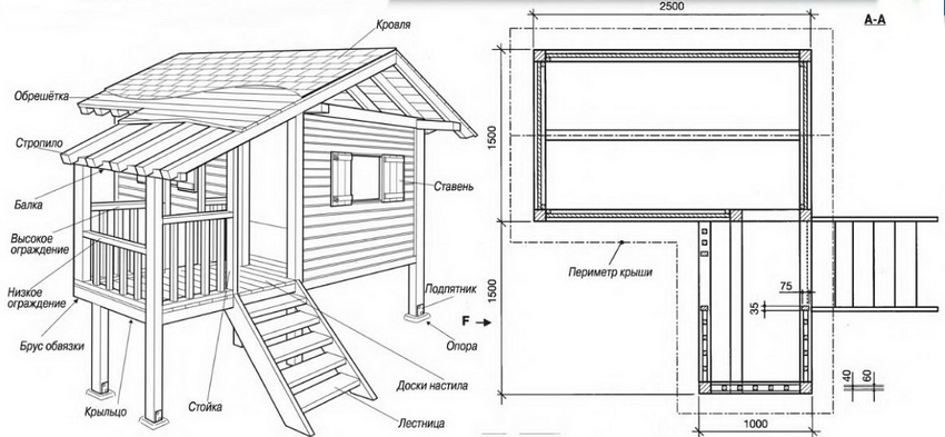 - форма крыши: односкатная под углом или двускатная, чтобы маленький ребёнок не мог на неё залезть;