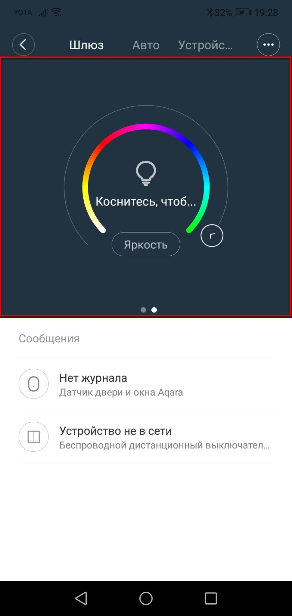 Свайпнув влево, появится настройка яркости шлюза aqara и задание цветовой палитры, шлюз будет светиться цветов в соответствии с параметрами, которые здесь будут настроены. На вкус и цвет товарищей нет, балуйтесь, настраивайте цветовую гамму на ваше усмотрение.