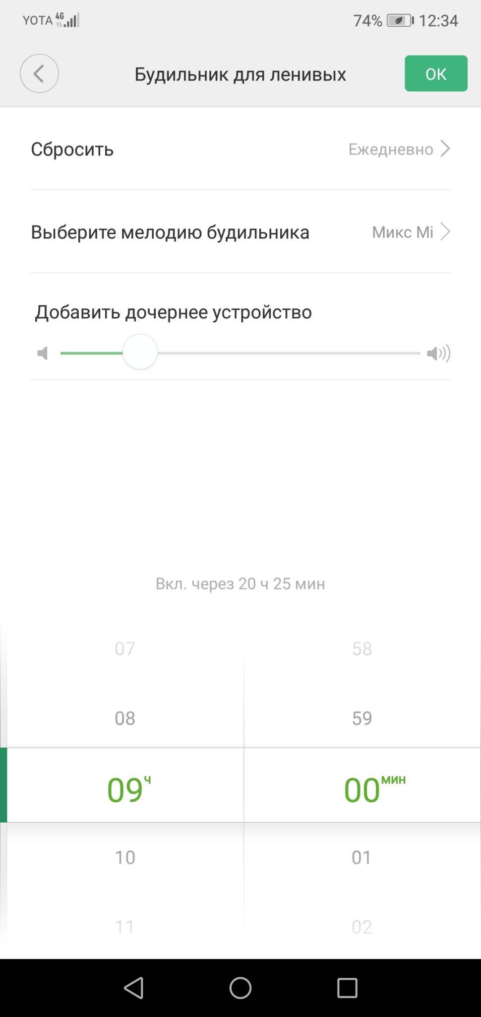 Можно сделать так, чтобы устройство само определяло нужный в зависимости от освещенности вокруг. Настроить можно также и будильник – когда он будет звонить и как (можно поставить какую-то песню).