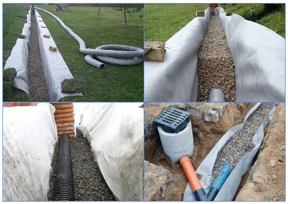 Траншеи закрываются щебнем, сверху они укрепляются геотекстилем.