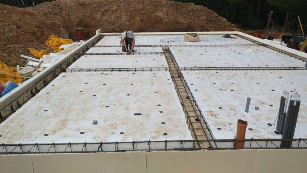 Канализация, водопровод, закладываются в тело фундамента, а обогрев пола делается с помощью водяных труб, подключенных к котлу. Прогрев осуществляется равномерно, поэтому на первом этаже строения не требуются радиаторы. Теплый пол обычно прячется в стяжку, но в случае с экономным основанием заливка не нужна.