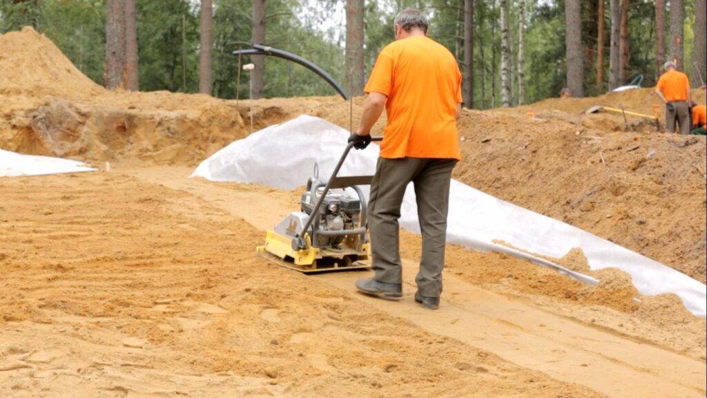 Далее приступают к обустройству амортизационной подушки толщиной около 15 см из гравия или щебня размером фракций 20-40 мм. Основание засыпается мелкодисперсным песком, который уплотняется каждые 20 см ручной трамбовкой или вибратором до достижения проектной отметки.