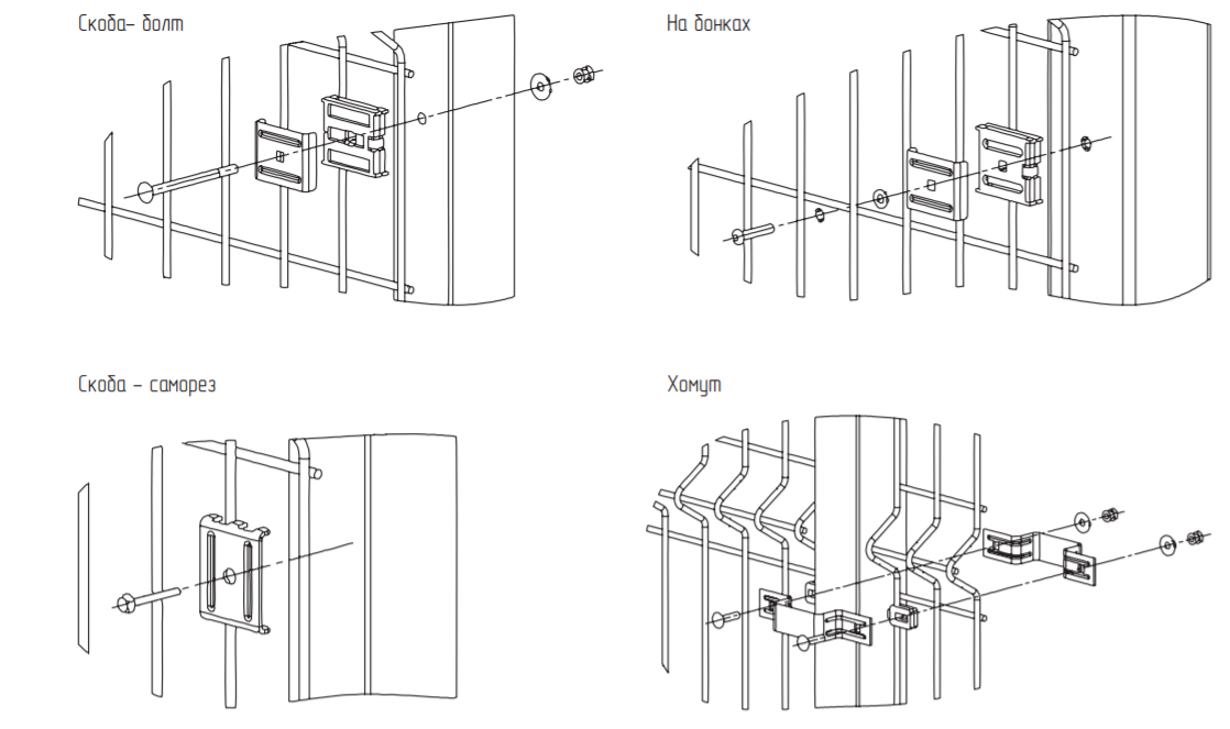 Для крепления одной опоры нужно минимум четыре хомута, которые располагаются сверху, снизу и в середине трубы на равном расстоянии. После этого монтаж ограждающей конструкции завершен.