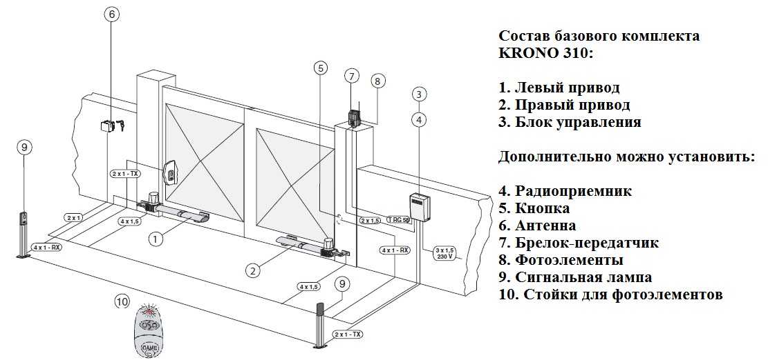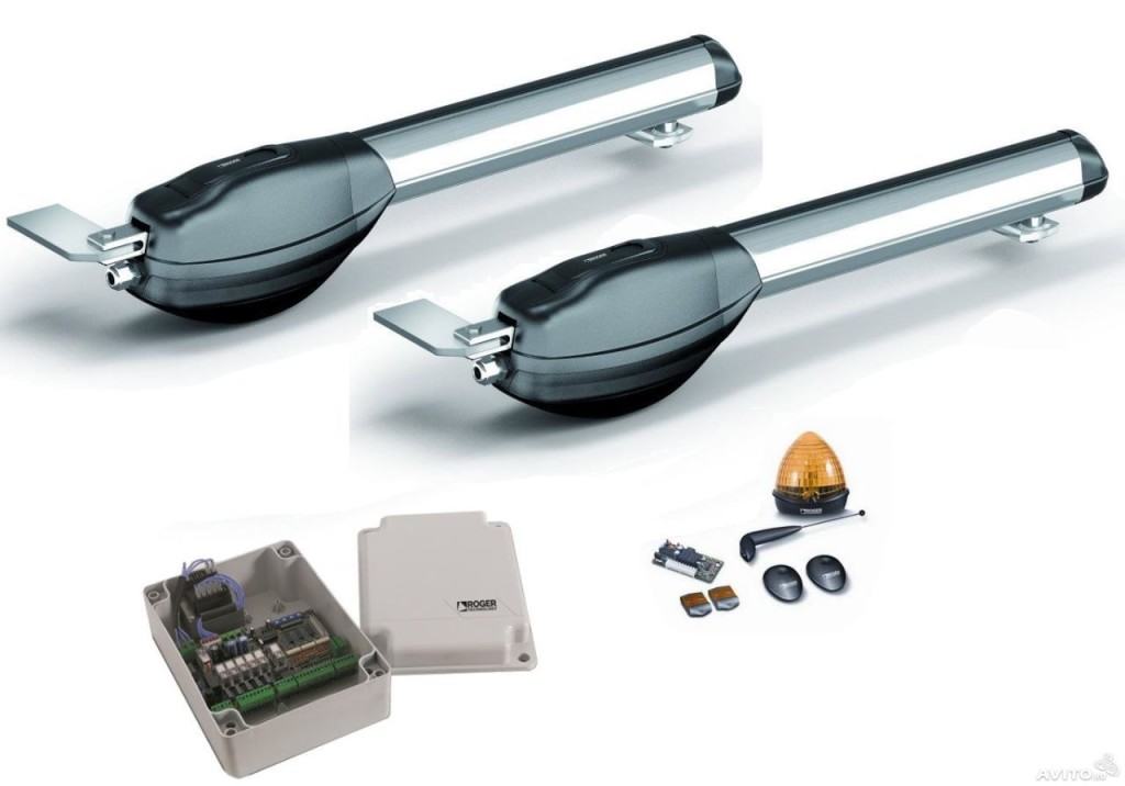 Данная система состоит из двух линейных электроприводов и блока управления, а также антенны, сигнальной лампы и электромагнитного замка. Стоит отметить, что автоматические распашные ворота подключают к обычной бытовой электрической сети переменного тока с напряжением в 220 Вт.