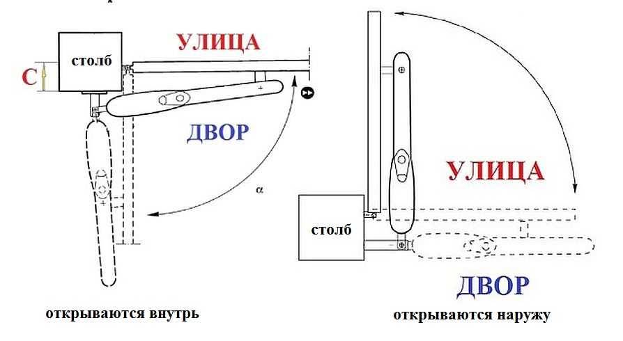 Все будет зависеть от направления открытия створа: вовнутрь, наружу или вовнутрь с доработкой несущих бетонных столбов. При каждом из них, установка автоматики идет в строго определенной последовательности. Иногда может потребоваться установка наружу, или на перспективу под будущую автоматизацию.