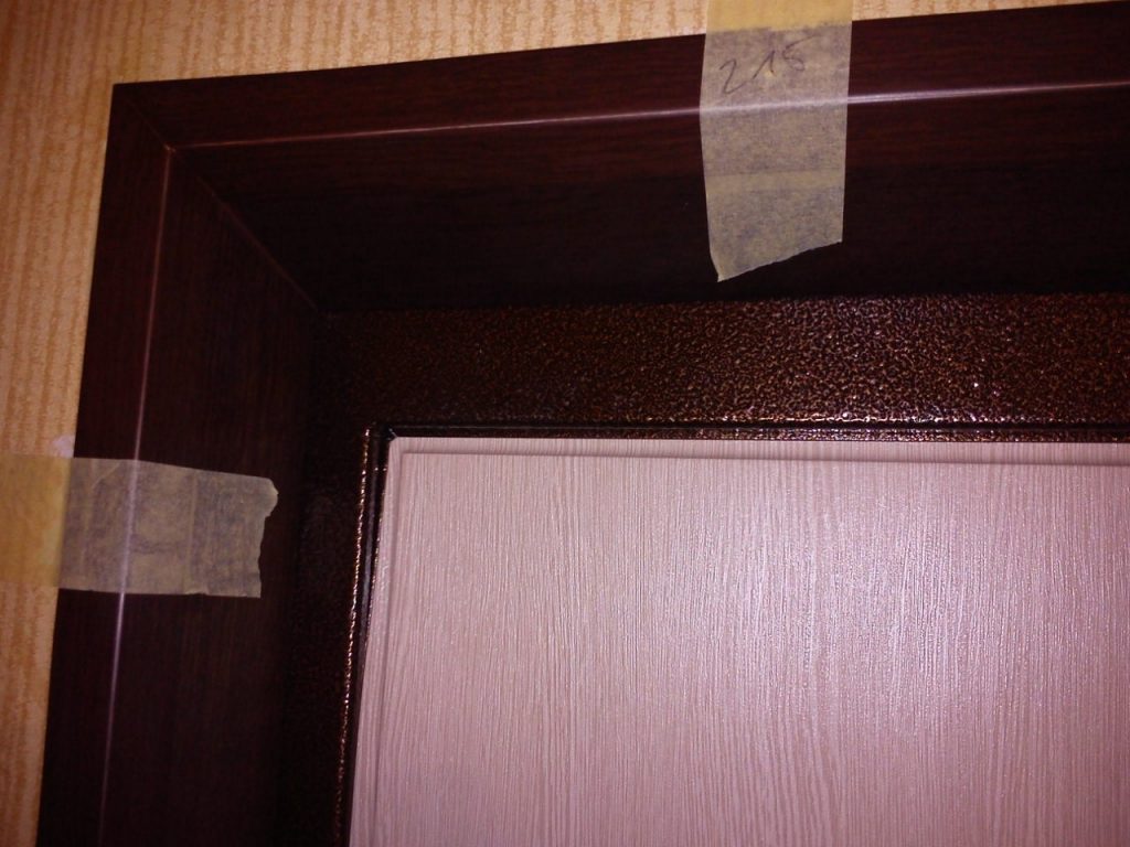 - Измерьте расстояние от внешнего края стены (со стороны откоса) до дверной коробки как минимум в трех местах. Если эти расстояния не совпадают, то добор придется подрезать в мебельной мастерской. На торец добора, к которому будет крепиться наличник, там же необходимо наклеить кромочную ленту.