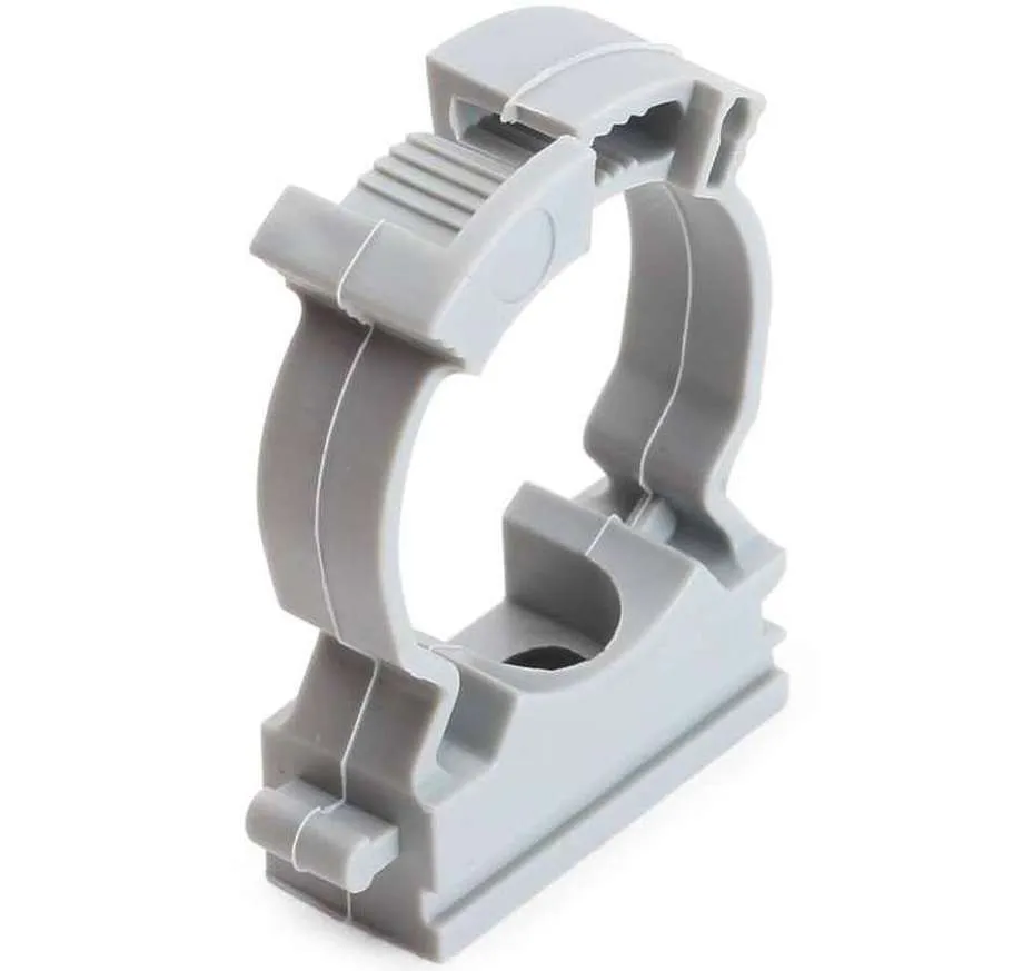 Это также комплектующий элемент сантехника. Пластиковые «полукольца» имеют плоскую монтажную площадку с отверстием. Такое исполнение может вызвать сомнение, что карниз вылетит. Если его резко не дергать, то такого не произойдет. Можно перестраховаться и выбрать такие же клипсы с защелкой.