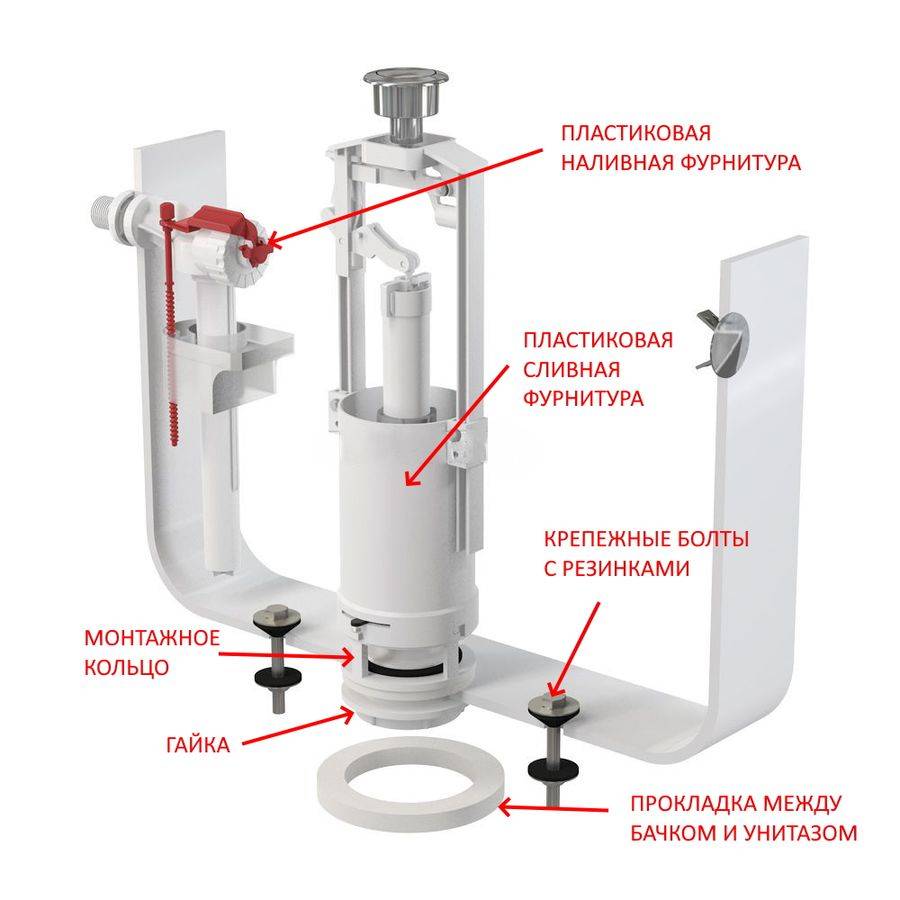 Перед установкой бачка сначала следует вкрутить в него специальное пластиковое монтажное кольцо от сливной фурнитуры. В последствии на данное кольцо будет крепиться сама фурнитура. Данное кольцо крепится на бачке с помощью большой пластиковой гайки.