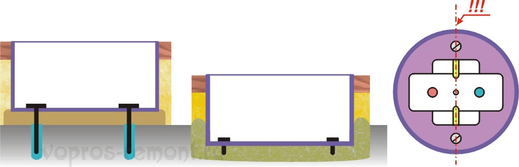 При «пухлой» отделке может понадобиться подушка из фанеры, слева на рис. Крепить подрозетник желательно саморезами в дюбелях. Если в нем крепежные отверстия не предусмотрены, их можно просверлить самому, но линия крепежных отверстий должна располагаться перпендикулярно линии контактов, на рис. – справа!
