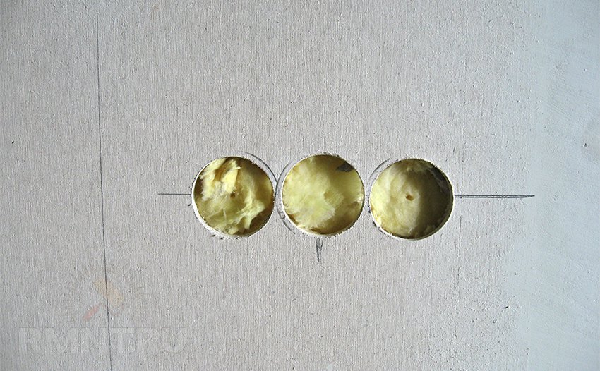 Сверлить первое отверстие нужно аккуратно и в том месте, где гарантированно не встретится кабель. Желательно не допускать вылета коронки внутрь полости фальшстены. Когда первое отверстие проделано, в него вытягивают кабель или убеждаются, что он не будет задет при дальнейших действиях и сверлят остальные. Когда все отверстия проделаны, перемычки между ними подрезают ножом, оставляя свободную полосу около 30–35 мм по центру.