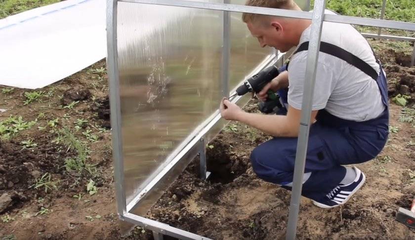 Покрывают остов листами поликарбоната встык или внахлёст с фиксацией саморезами. В конце устанавливают двери, форточки, фурнитуру (ручки, защёлки и др.)