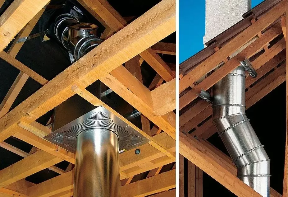 В кровельном материале изготавливают отверстие для вывода трубы. Чтобы разместился между стропильными ногами, пользуются отводами, которые позволяют сделать отверстие в удобном месте. Если кровельный материал горючий, его защищают металлическим листом или асбестом, выводят трубу в отверстие, одевают на нее эластичный резиновый уплотнитель и приклеивают огнестойким герметиком.