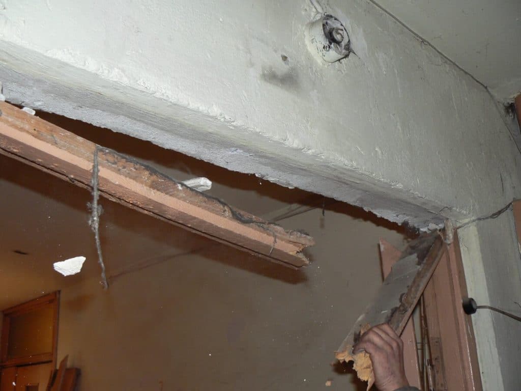 Но если дом старый и входная дверь эксплуатировалась не один десяток лет, тогда необходимо проверить балку перекрытия, которая устанавливается над дверным проемом. Если ее качество оставляет желать лучшего, то стоит подумать над тем, как ее заменить. Своими руками эту ремонтную операцию лучше не проводить.