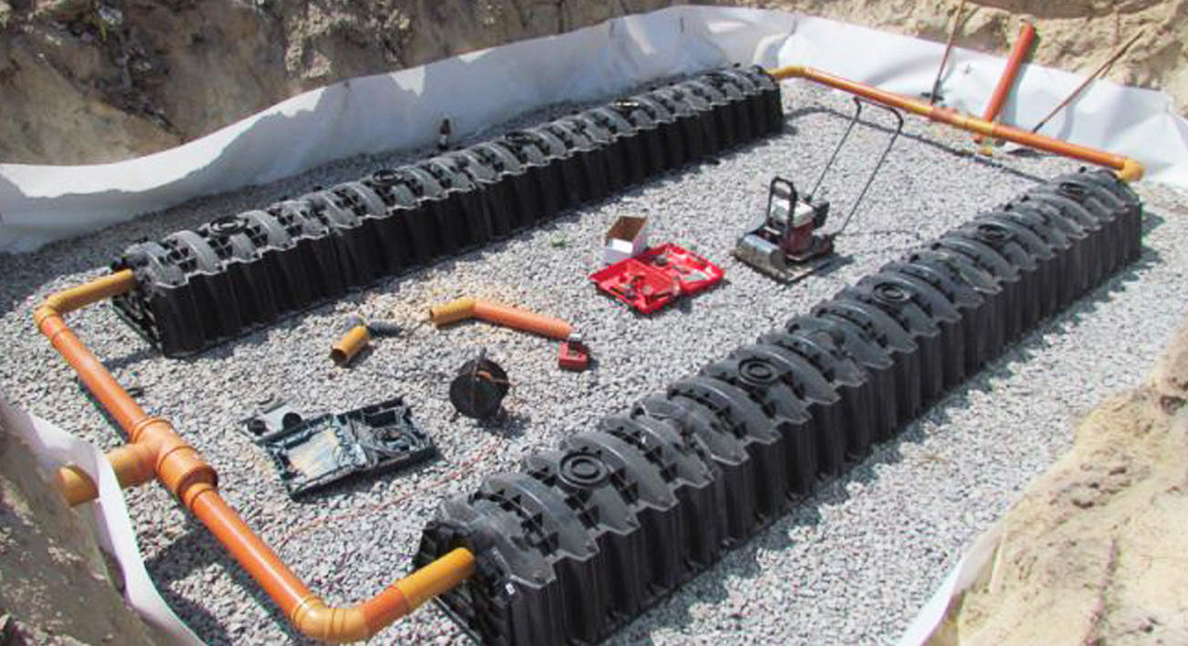 Сначала роют котлован или сеть траншей. На дно укладывают слой песчано-гравийной смеси. Сверху располагают геотекстиль, который пропускает жидкость, но задерживает мелкие фракции стоков. Затем насыпают подушку из щебня или гравия, на которую укладывают трубы. Для этих целей используют специальные дренажные трубы с отверстиями