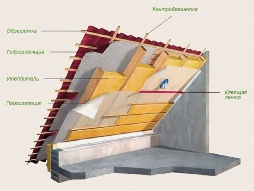 Снизу для надежного закрепления выполняют обрешетку, по которой ведутся отделочные работы. Поверх утеплителя необходимо обеспечение воздушного зазора для удаления образовавшейся влаги. Величину такой прослойки принимают 3-5 см. Она обеспечивается за счет высоты стропил или монтажа контррейки.