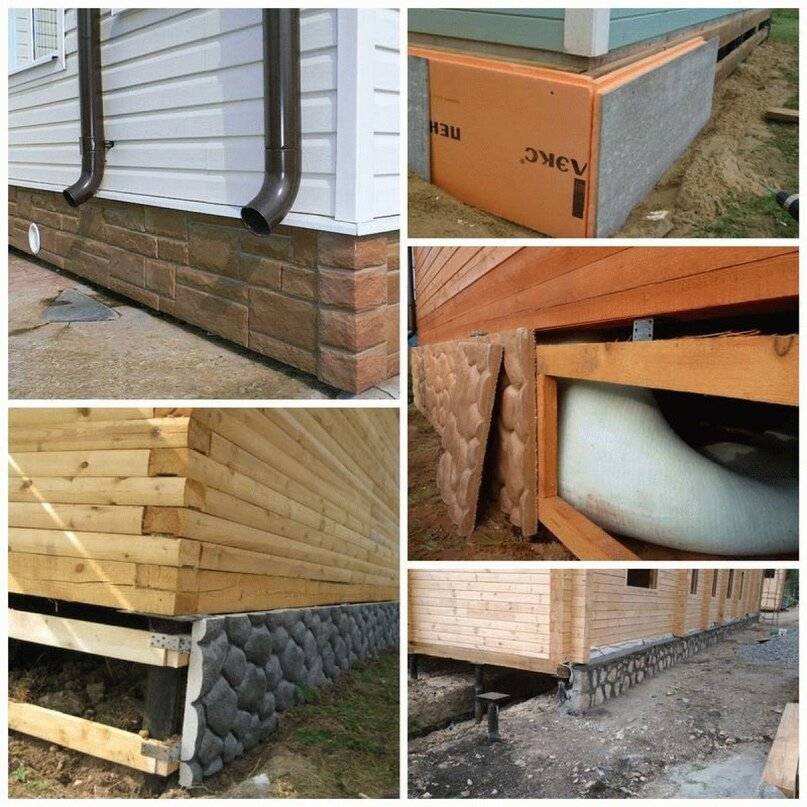 Оно будет намного лучше внутреннего утепления, так как последнее можно использовать лишь при хорошем вентилировании подвала. В противном случае будет смещена точка росы, и на основание будет воздействовать низкий уровень температуры и влажность. При утеплении дома снаружи такие моменты исключены. В зависимости от подбора основания (столбчатое, ленточное, монолитное или свайное), подбирается и материал, которым требуется обшивать основание дома из древесины. Утеплительный процесс должен быть произведен при строительстве основания.