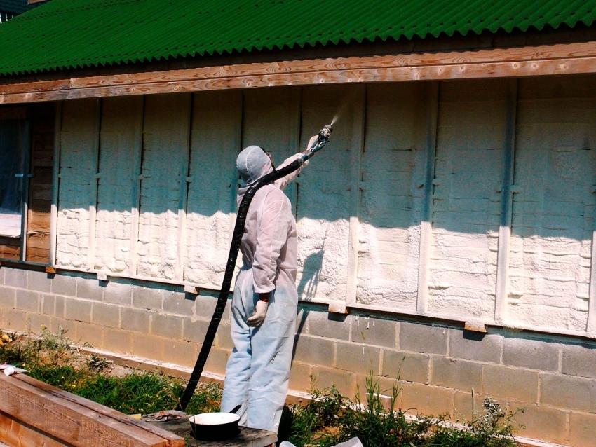 - пенополиуретан (прочный, низкая теплопроводность, долговечность, устойчивость к температурным перепадам, отсутствие швов при нанесении, однако, может создавать давление в трещинах здания, подвержен влиянию ультрафиолета, низкая пожаробезопасность при нанесении);