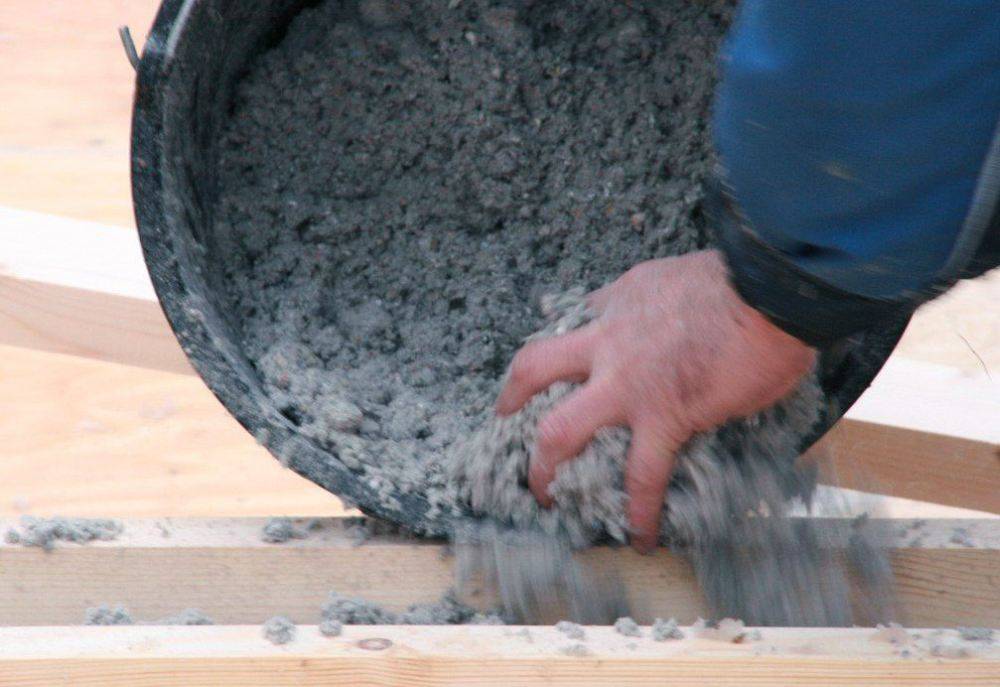 - взбитая масса высыпается между лагами на основание пола или в обрешетку на перекрытии потолка;