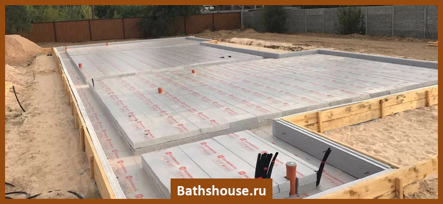 - Заложить плиты в опалубку (или в траншею, если фундамент щелевой). При застывании залитой бетонной смеси утеплитель отлично сцепится с цементным камнем.