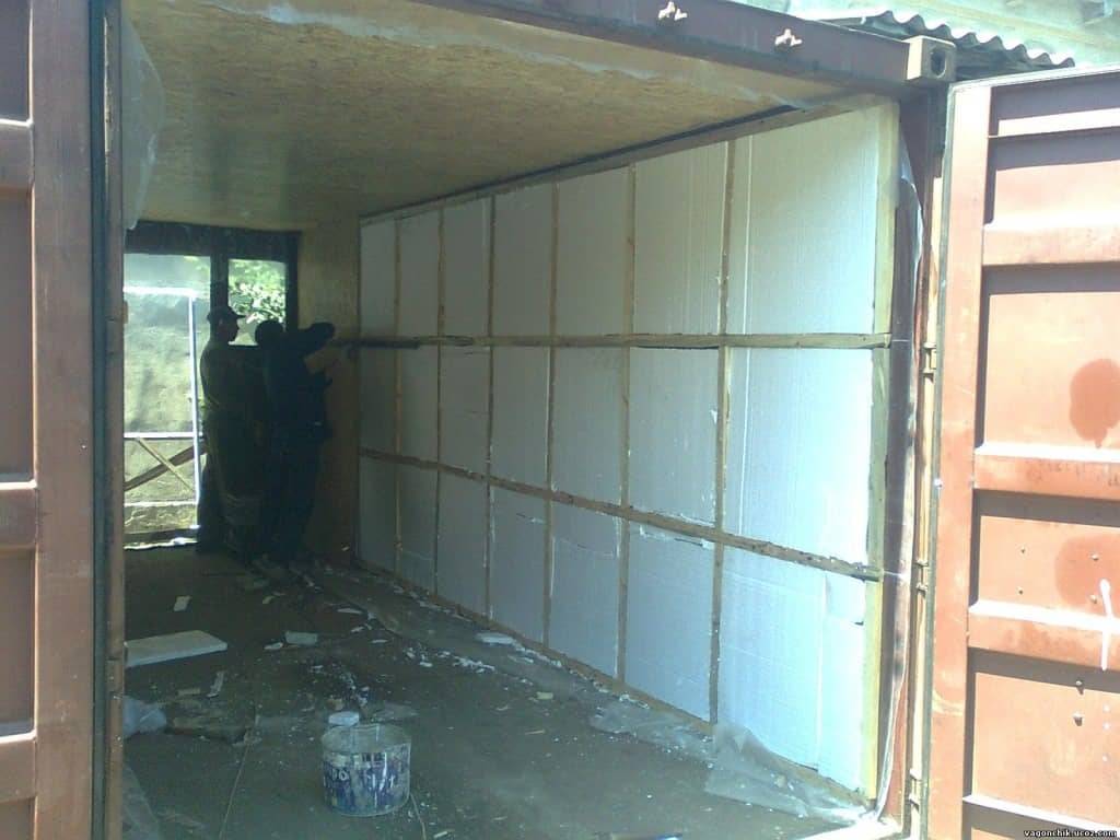 Утепление контейнера изнутри возможно, когда потери части объема внутреннего пространства не имеют значения. Проводимые при этом работы разбиваются на два этапа: отделка боковых поверхностей и теплоизоляция потолка. При их проведении в первую очередь следует утеплить стены. Для этого на них крепится деревянная обрешетка, состоящая из брусков подходящего размера. Затем в промежутки между ними укладываются пластины выбранного теплоизолятора (пенополистирола, например). Для усиления эффекта изоляции от холодных воздушных масс его дополнительно обклеивают слоем пенофола.
