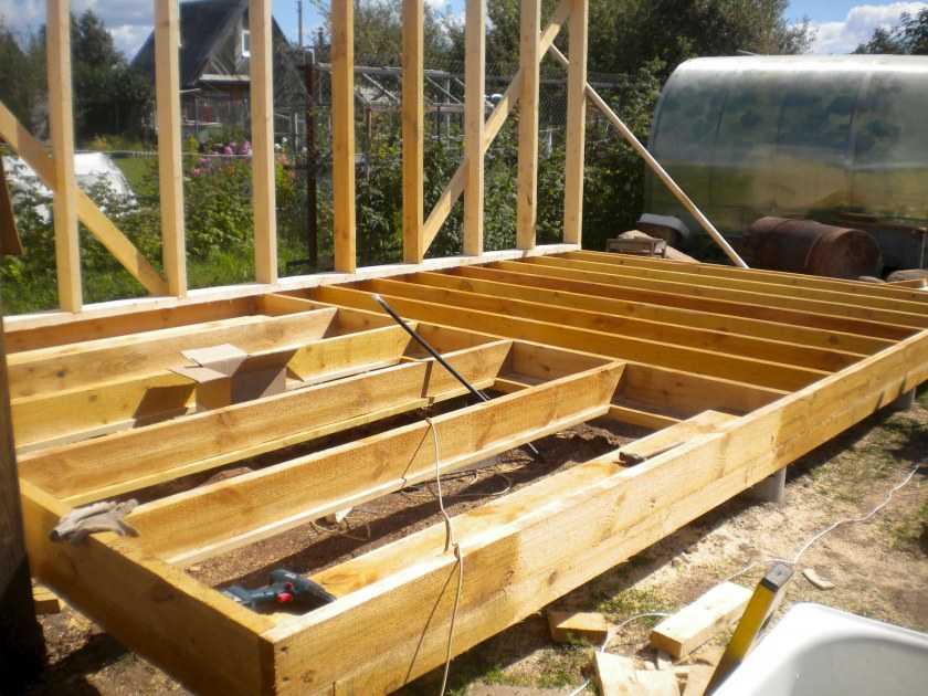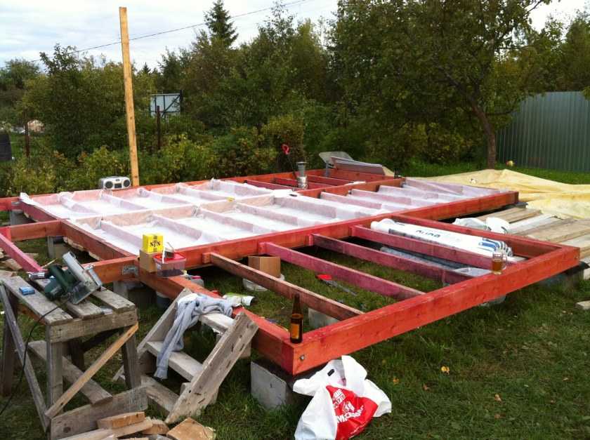 После этого на пол кладут слой утеплителя (минеральную или базальтовую вату, пенопласт), который затягивается плёнкой для гидроизоляции. В качестве чистового пола укладывается шпунтованная доска или плитка.