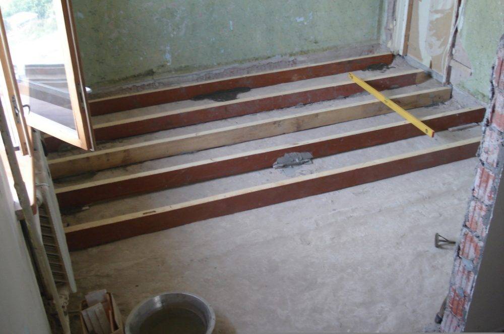 Итак, если лаги были полностью демонтированы, необходимо установить новые. Для этого берут прочные деревянные рейки или брус, обрезают по размеру пола, грунтуют антисептическим раствором и просушивают. Высота деревянного каркаса для пола должна быть минимум 10 см. Крайние рейки крепят на расстоянии 2-3 см от поверхности стен, между остальными делают промежуток от 0,5 до 1 метра. Каждую рейку нужно выставить по уровню и параллельно другим, чтобы ни одна деталь не выступала из горизонтальной плоскости.