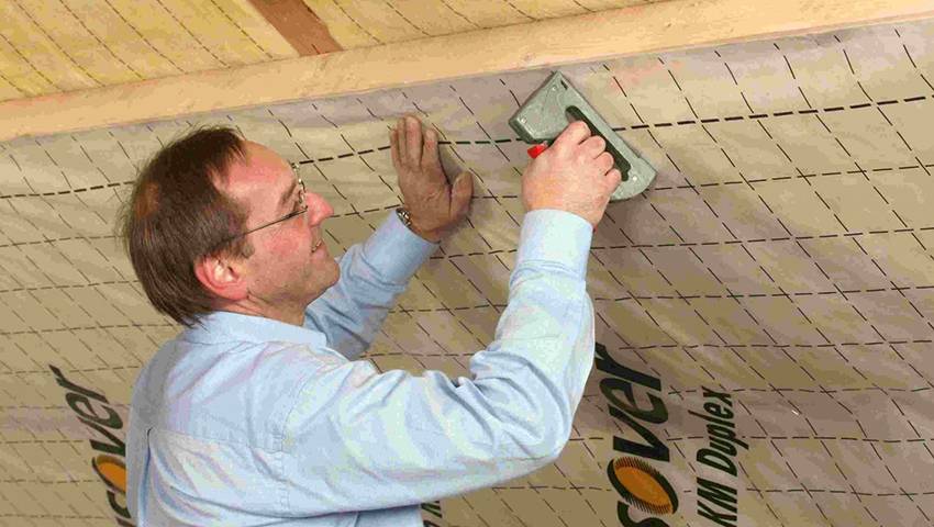 Основное предназначение пароизоляционного барьера — защита строительных конструкций от конденсата и сдерживание поднимающегося вверх тепла. Пароизоляционный материал должен плотно прилегать к балкам. В ином случае будут возникать «мостики холода», сквозь которые будет уходить тепло из дома.