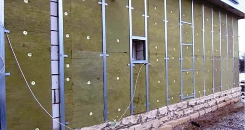 Далее устанавливается паронитовая прокладка и кронштейны. Анкерные болты хорошо затягиваются, а в минераловатных плит проделываются отверстия. Это позволит установить материал без клея. Теплоизоляция устанавливается на кронштейны, плиты стыкуются между собой. За счет каркаса они будут удалены от основной стены.