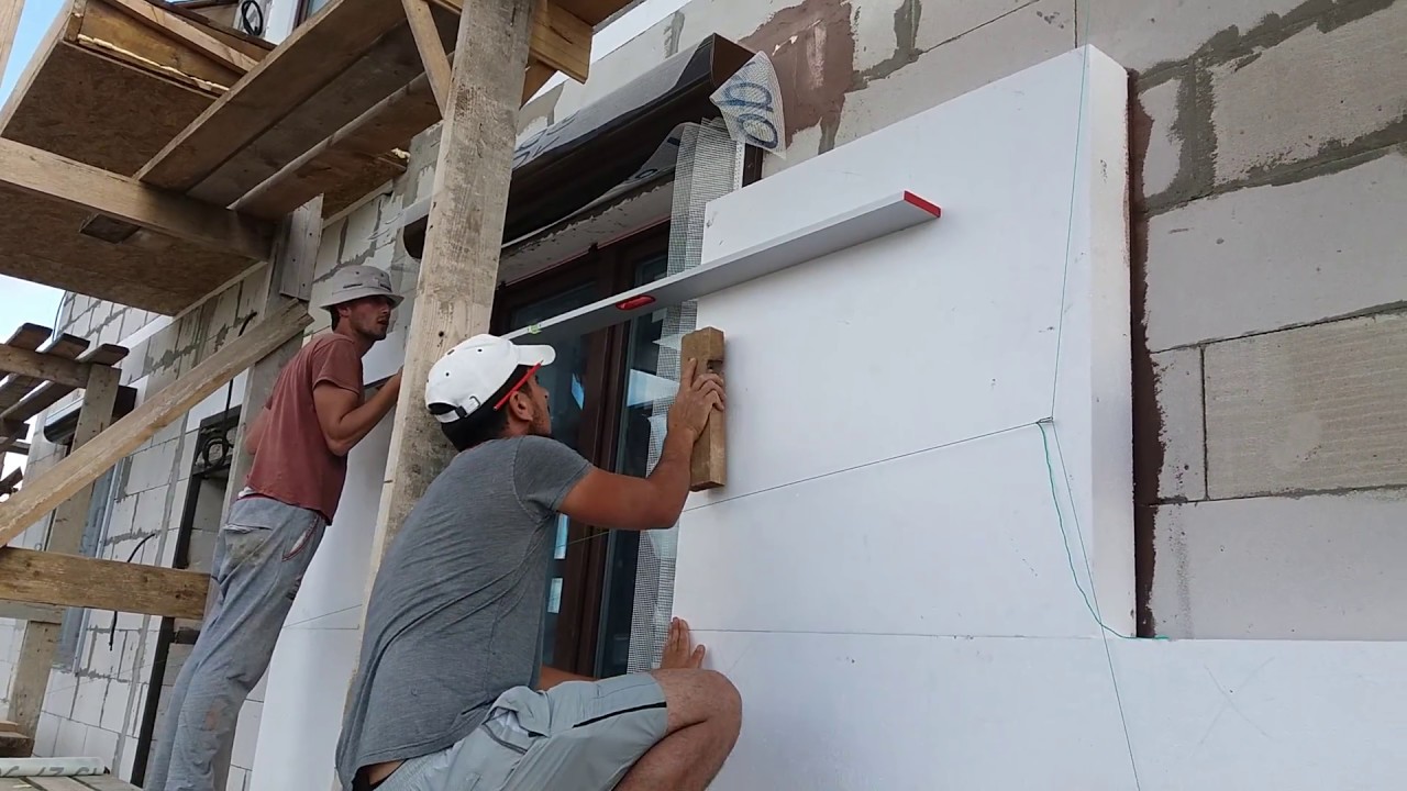 - Следующий этап — крепление теплоизолятора на клей. Снизу нужно предусмотреть стартовый профиль, который послужит опорой первого ряда. После того как клеевой состав высохнет, изоляцию фасада своими руками дополнительно фиксируют на пластиковые дюбеля-грибки.
