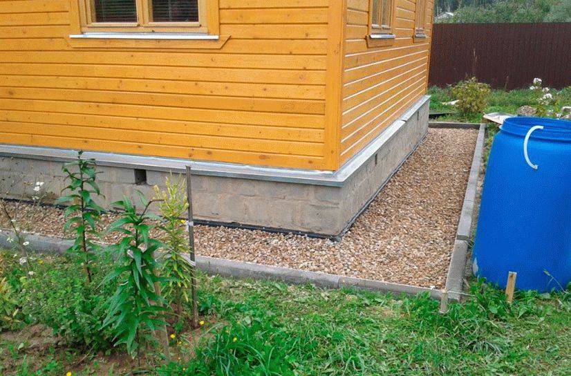 Это полоса шириной не менее 60 см, но с тем условием, что она не может быть меньше или совпадать с выступом крыши, выполненная из разных строительных материалов с обязательным использованием утеплителя, расположенная по периметру постройки и призванная защитить ее от влаги и низких температур. Независимо от того, из чего решено соорудить защиту для фундамента, потребуется выполнить два вида обязательных работ: