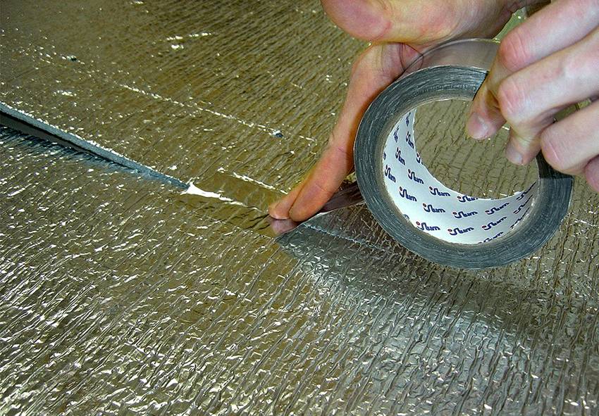 - Монтаж теплоизоляции выполняется с помощью строительного степлера, швы при этом тщательно проклеиваются алюминиевым скотчем. Для обеспечения вывода конденсата в месте примыкания стены к полу делается небольшой вывод полотна материала.