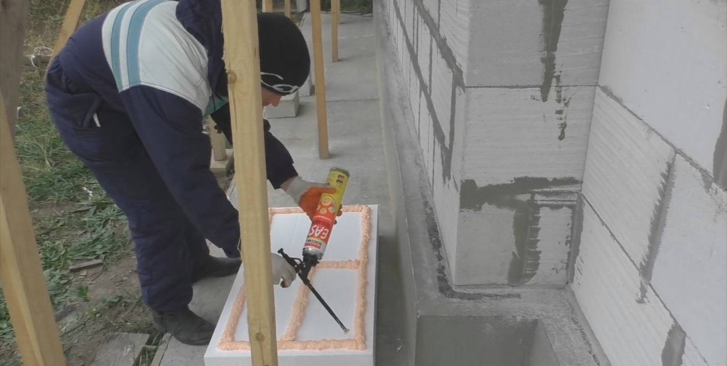 Клеем-пеной утеплитель надежно фиксируется на гладких бетонных поверхностях. Из пистолета состав наносят по периметру и центру. Пазы также заполняются клеем, лист прижимается и удерживается 30 сек. Монтаж дюбелями и дальнейшие работы можно производить через 2 часа.
