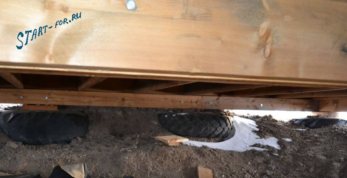 Собирал коробку на покрышках, промерял все расстояния, когда была собрана своеобразная «восьмерка» — выровнял диагонали. После выравнивания завершил собирать обвязку прибивая доски одну за одной.