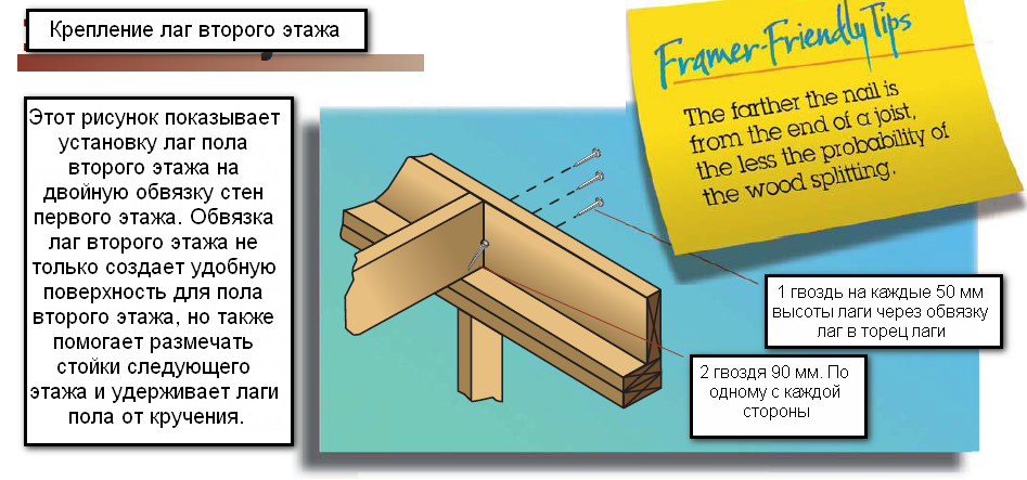 Бой гвоздей в лаги перекрытия через обвязку лаг (справедливо и для первого этажа, где вместо обвязке — лежень или обвязка свай):