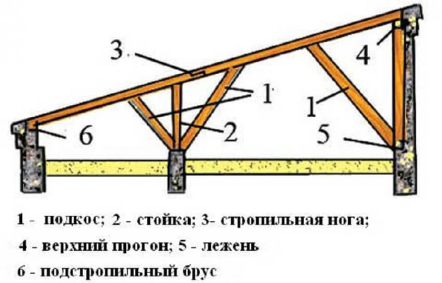 - стойка — брус, дополнительно укрепляющий конструкцию. Устанавливается между лежнем и прогоном. Благодаря стойкам часть нагрузки переходит на несущую стену внутри.