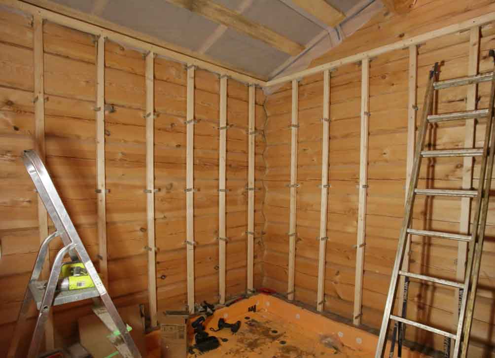 - На потолке, стенах делаем обрешетку из деревянных реек средней толщины 5‒10 см (точная цифра зависит от толщины утеплителя).