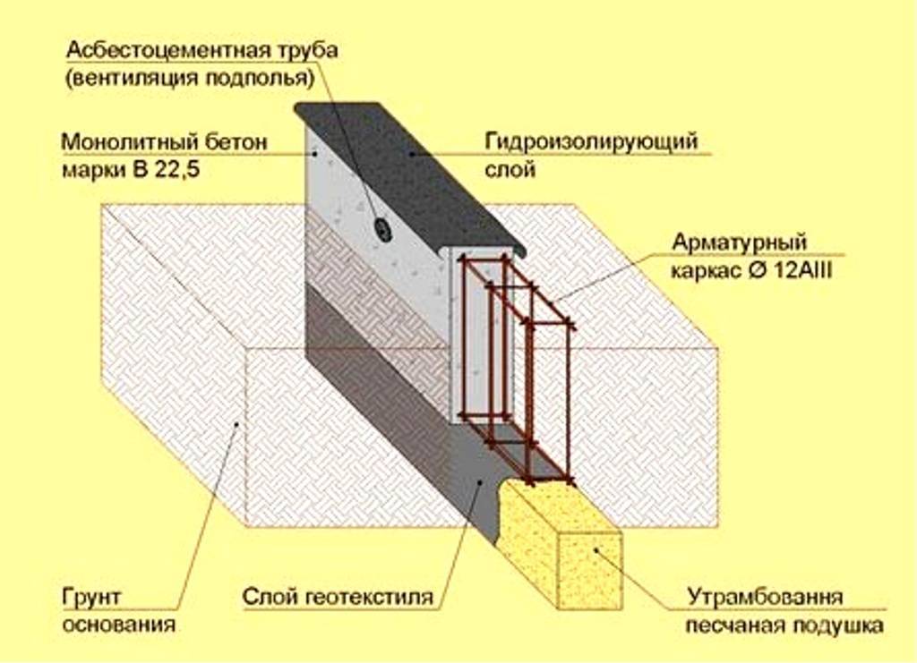 Так при длине стены до 3 м суммарное сечение всех стержней в ряду должно составлять более 0,1% ширины ленты, причем диаметр одного стержня выбирается не менее 10 мм. Если длина стены превышает 3 м, то общее сечение подчиняется аналогичному требованию, но диаметр одного стержня должен превышать 12 мм.