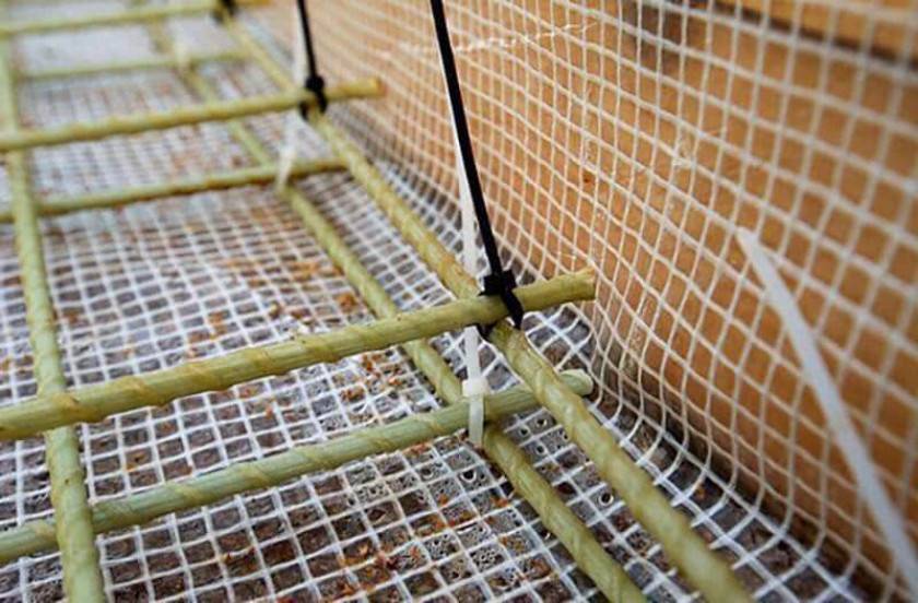 В деревянном приспособлении нужно просверлить пазы и отверстия, которые повторят очертания стержней в каркасе. В такие отверстия заранее раскладывают куски вязальной проволоки длиной по 20 см, а после этого фиксируют пруты армирования.