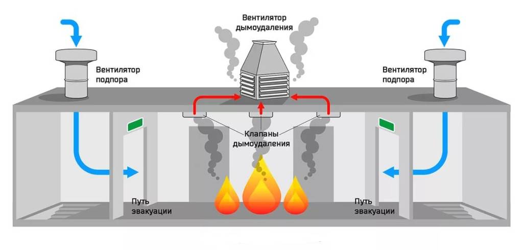 Теперь о том, как работает дымоудаление и подпор воздуха, когда горит сооружение.