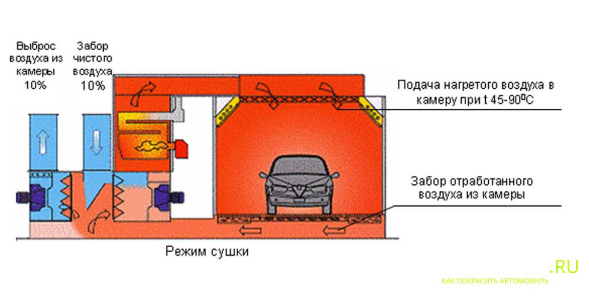 - Сушка – равномерная подача горячего воздуха или нагрев краски инфракрасными пушками (40-80 ˚C).
