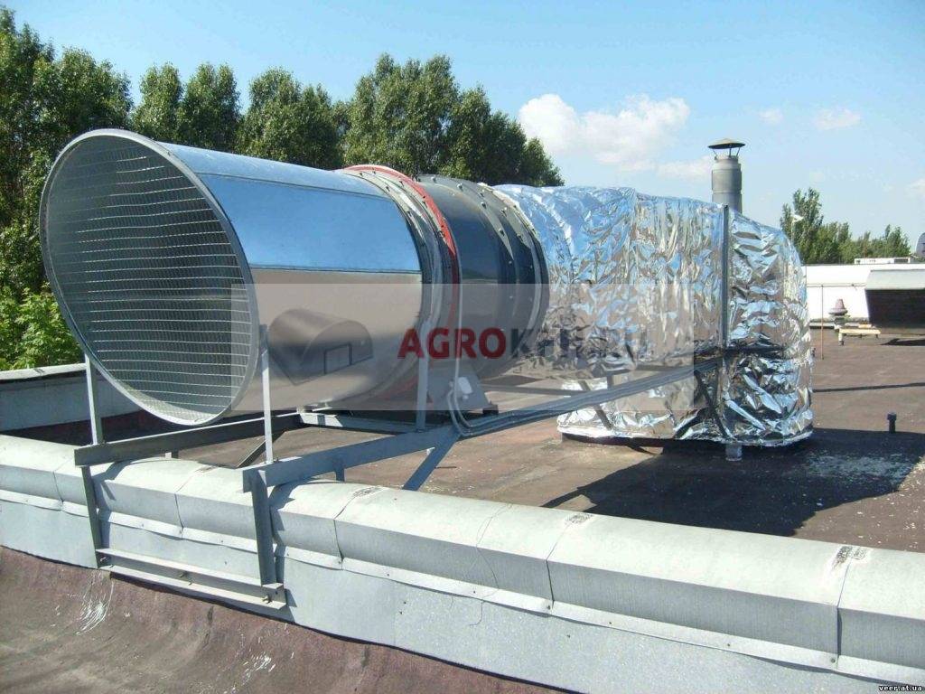 Иногда при строительстве производственного помещения расчет вентиляции не производится, оборудование не монтируют. Тогда можно в уже готовом цеху разместить шахты и каналы, работающие за счет теплового напора. Выходы шахт прикрывают оголовками-дефлекторами. Ветер обдувает дефлектор и формирует в трубе область разрежения, усиливая подсос воздуха. Подобная система широко используется в сельскохозяйственных и животноводческих постройках, кузнях, небольших пекарнях. Устанавливается труба на самом высоком выступе крыши.